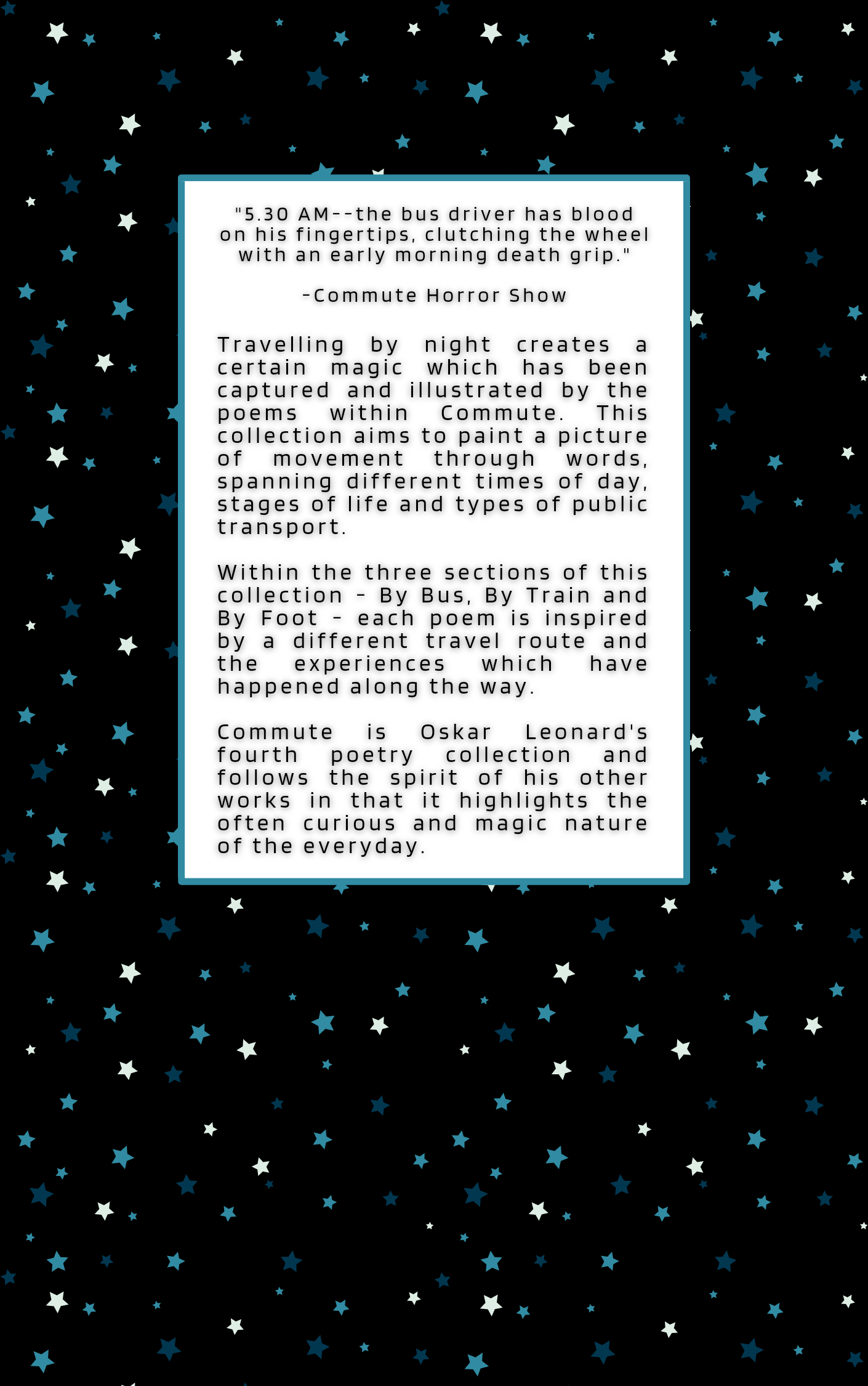 Travelling by night creates a certain magic which has been captured and illustrated by the poems within Commute. This collection aims to paint a picture of movement through words, spanning different times of day, stages of life and types of public transport.
